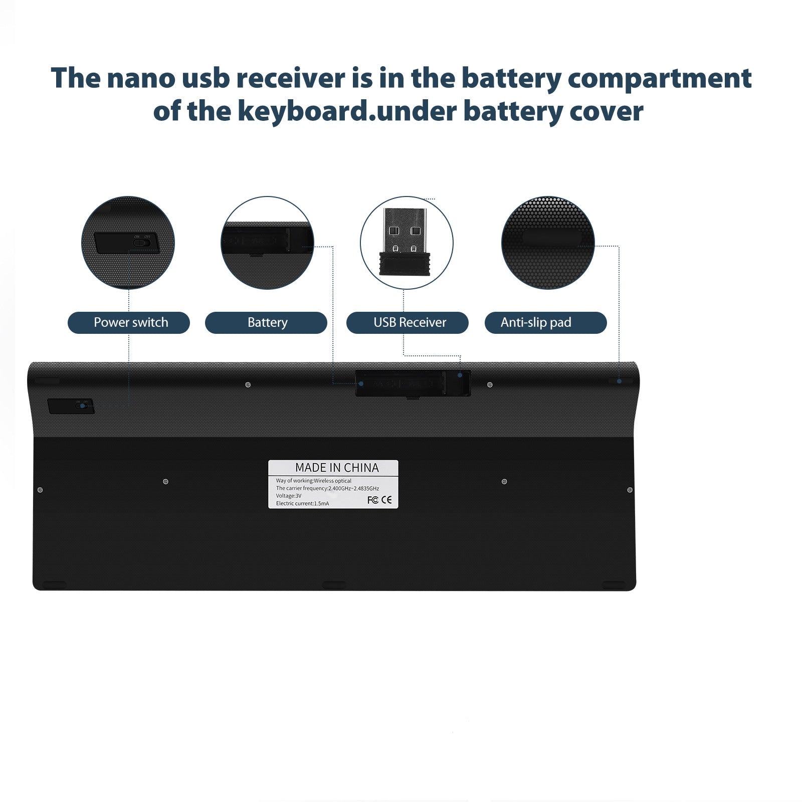 Kit completo: include 1 tastiera wireless, 1 ricevitore USB nano (riposto sul retro della tastiera), 1 manuale utente.