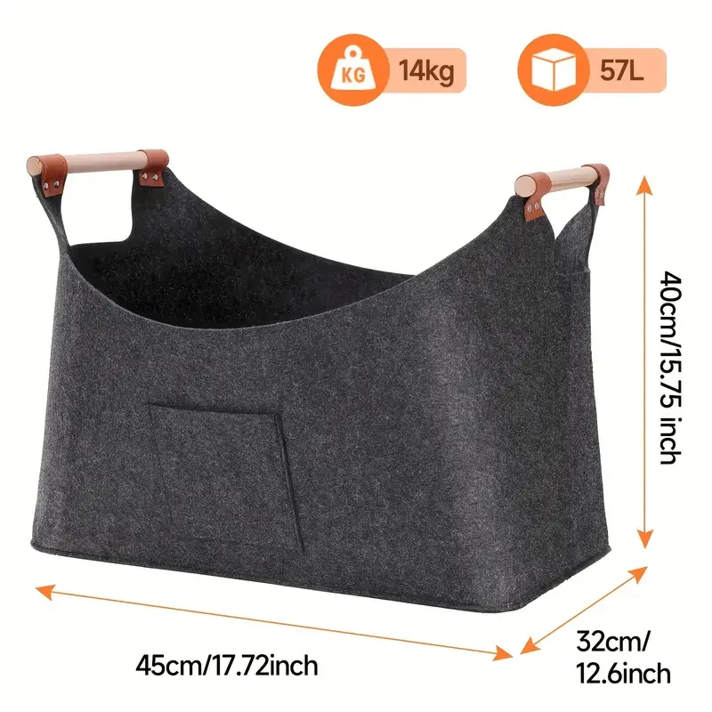 Cesto Biancheria Manici Legno Feltro Grigio Scuro Organizzazione Casa Bagno Vestiti Arredamento Capacità Carico 14kg