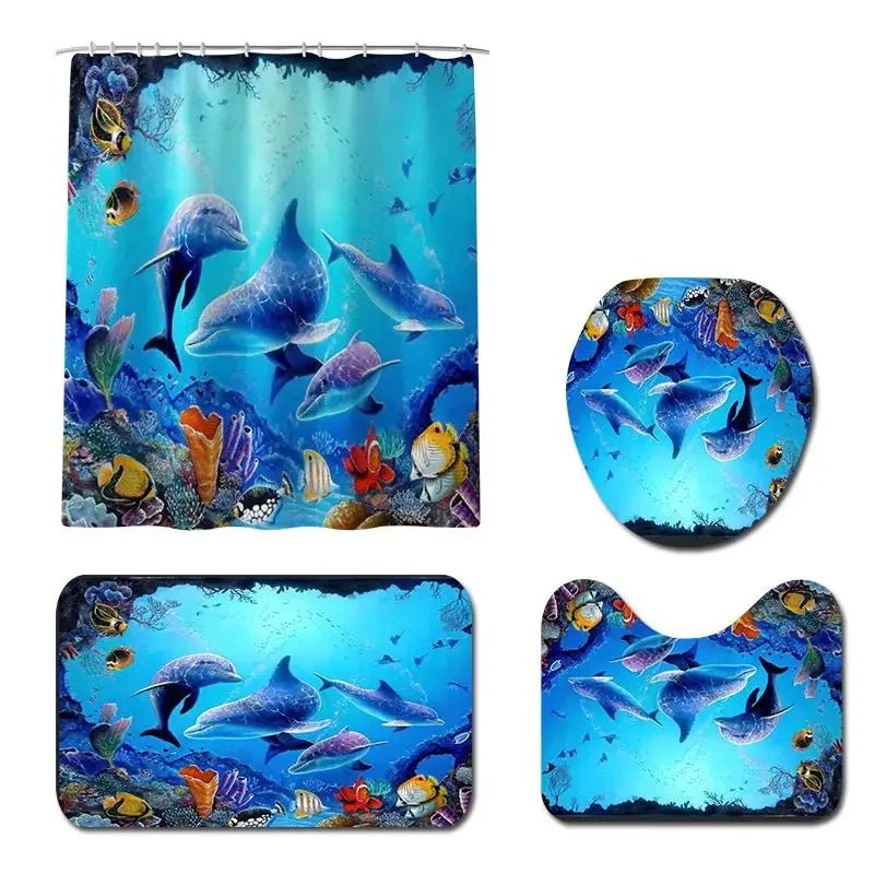 Set da bagno Quattro Pezzi Modello Acquario Tenda Tessuto Impermeabile 12 Ganci Tappeto Antiscivolo Arredamento