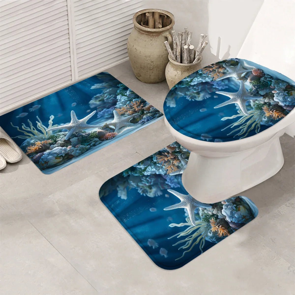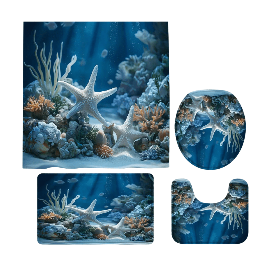 Set da bagno Quattro Pezzi Modello Oceano Tenda Tessuto Impermeabile 12 Ganci Tappeto Antiscivolo Arredamento